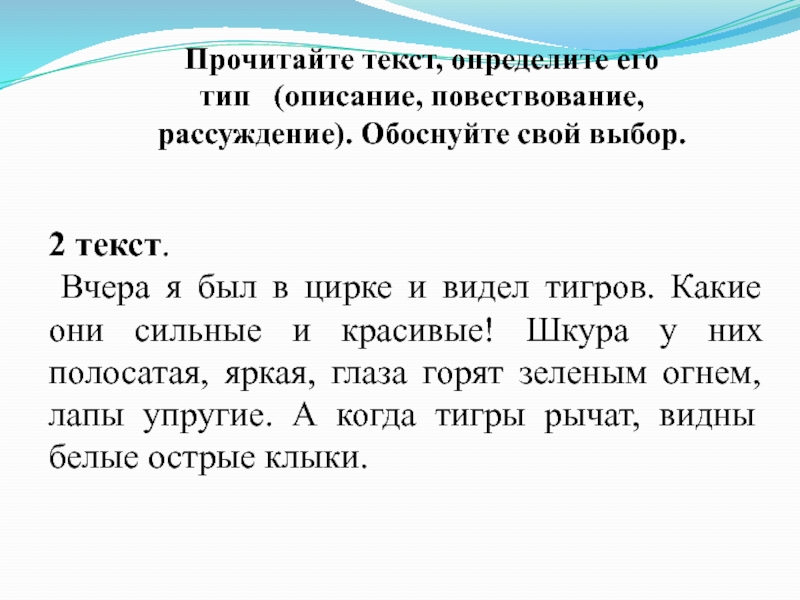 Вчера я был в цирке и видел тигров. Какие они сильные и красивые! Шкура у них полосатая, яркая, глаза горят зеленым огнем, лапы упругие. А когда тигры рычат, видны белые острые клыки.