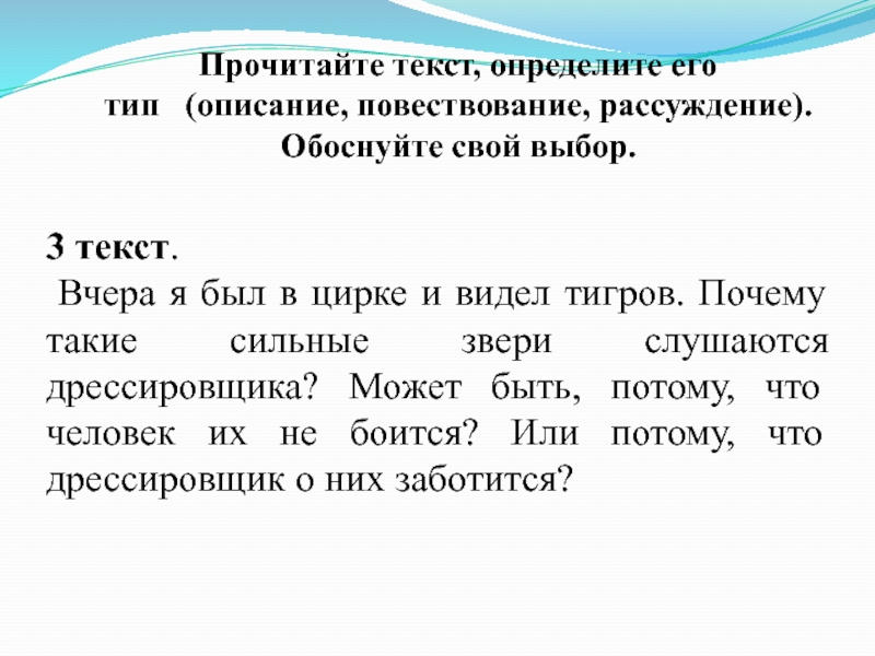 Вчера я был в цирке и видел тигров. Почему такие сильные звери слушаются дрессировщика? Может быть, потому, что человек их не боится? Или потому, что дрессировщик о них заботится?