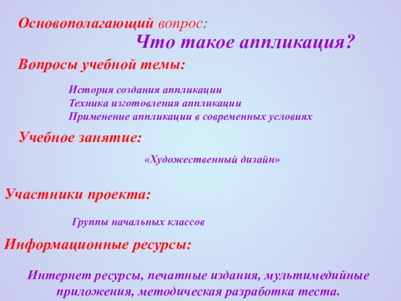 Интернет ресурсы, печатные издания, мультимедийные приложения, методическая разработка теста.