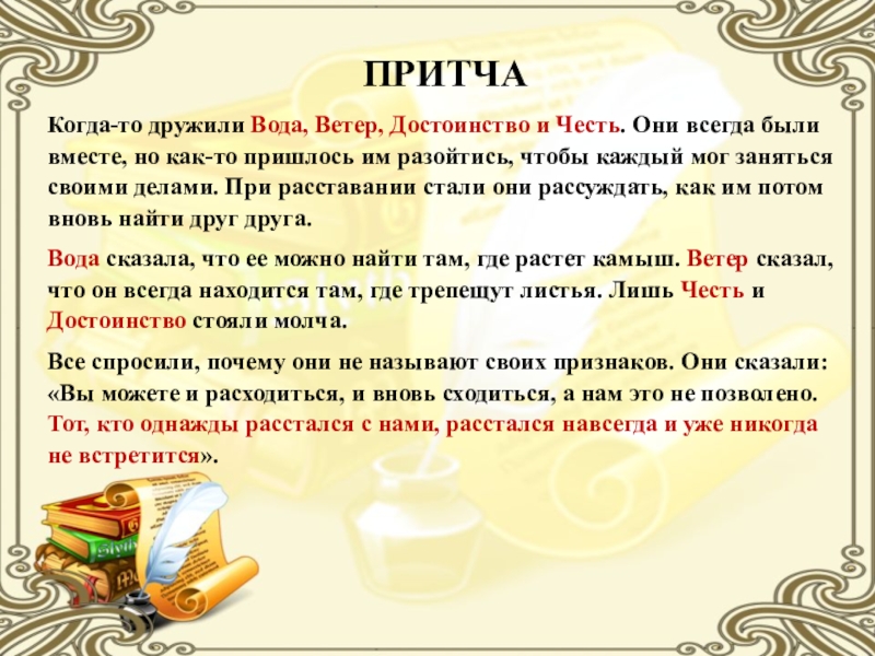 ПРИТЧАКогда-то дружили Вода, Ветер, Достоинство и Честь. Они всегда были вместе, но как-то пришлось им разойтись,