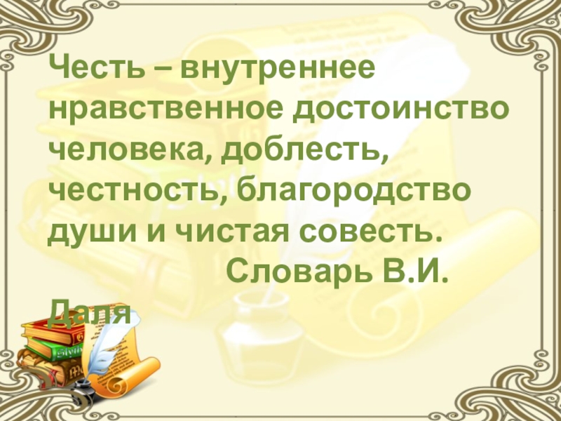 Слайд 4Честь – внутреннее нравственное достоинство человека, доблесть, честность, благородство души и