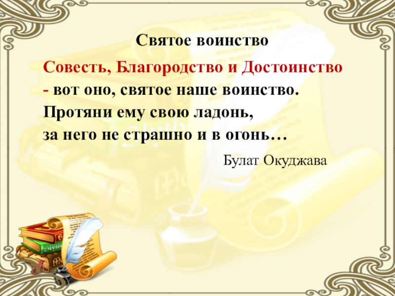 Святое воинствоСовесть, Благородство и Достоинство - вот оно, святое наше воинство.   Протяни ему свою ладонь,   за него не