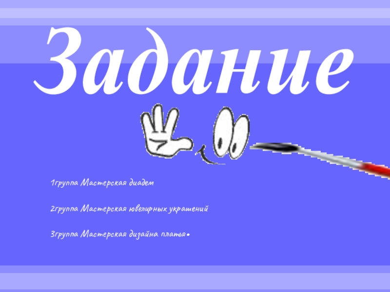 1группа Мастерская диадем2группа Мастерская ювелирных украшений3группа Мастерская дизайна платья.Задание