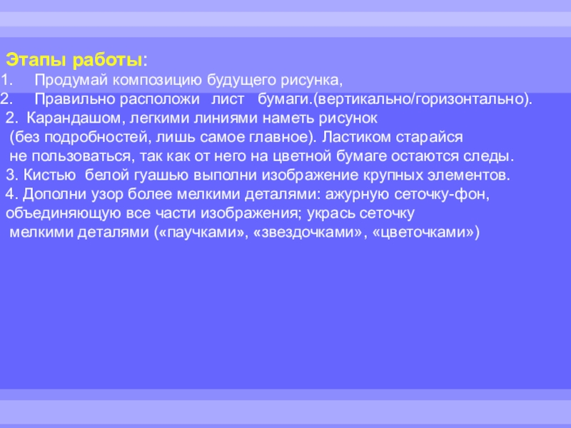 Этапы работы:Продумай композицию будущего рисунка, Правильно расположи   лист  бумаги.(вертикально/горизонтально).2.  Карандашом, легкими линиями наметь рисунок (без подробностей,