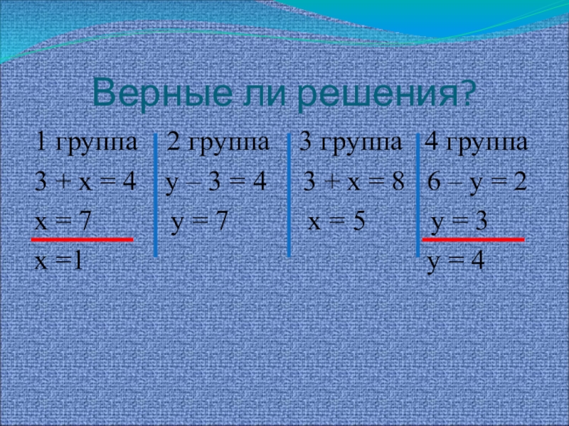 Верные ли решения?1 группа  2 группа  3 группа  4 группа3 + х = 4
