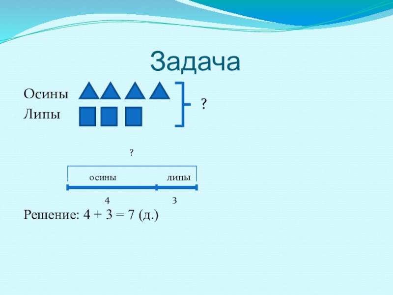 ЗадачаОсины Липы  Решение: 4 + 3 = 7 (д.)?осинылипы43?