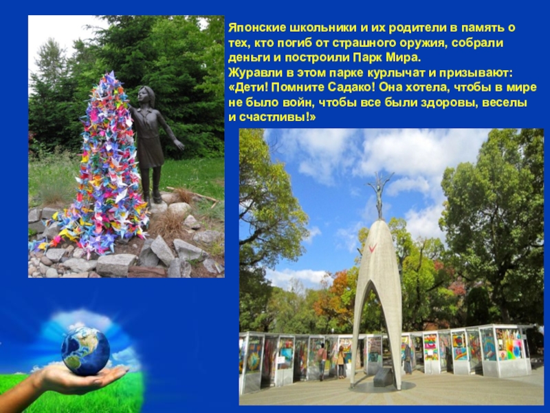 Журавли в этом парке курлычат и призывают: «Дети! Помните Садако! Она хотела, чтобы в мире не было войн, чтобы все были здоровы, веселы и счастливы!»