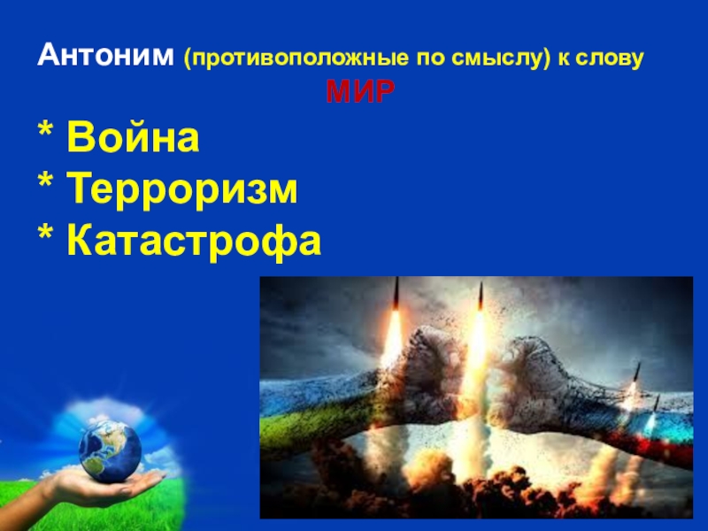 Слайд 42. Мир - это дружба, отсутствие войны ,тишина , покой.