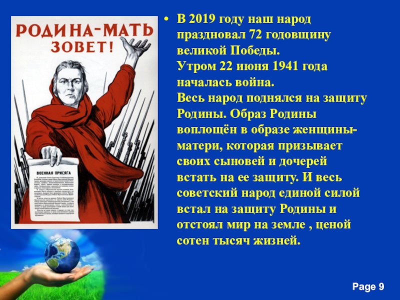 Весь народ поднялся на защиту Родины. Образ Родины воплощён в образе женщины-матери, которая призывает своих сыновей и дочерей встать на ее защиту. И весь советский народ единой силой встал на защиту Родины и отстоял мир на земле , ценой сотен тысяч жизней.