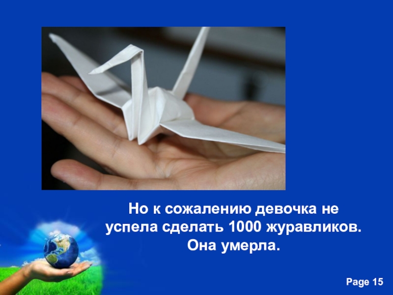 Но к сожалению девочка не успела сделать 1000 журавликов. Она умерла.