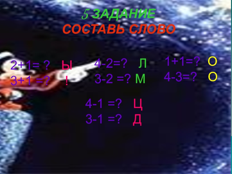 5 ЗАДАНИЕ СОСТАВЬ СЛОВО2+1= ?  Ы3+1 =?  !4-2=?  Л3-2 =? М1+1=? О4-3=?  О