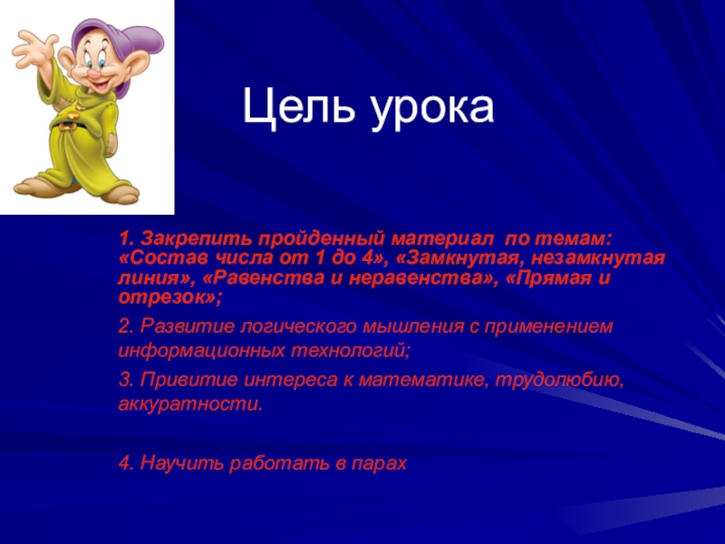 Цель урока1. Закрепить пройденный материал по темам: «Состав числа от 1 до 4», «Замкнутая, незамкнутая линия», «Равенства и неравенства», «Прямая и отрезок»; 2. Развитие логического мышления с применением информационных технологий;3. Привитие интереса к математике, трудолюбию, аккуратности.4.