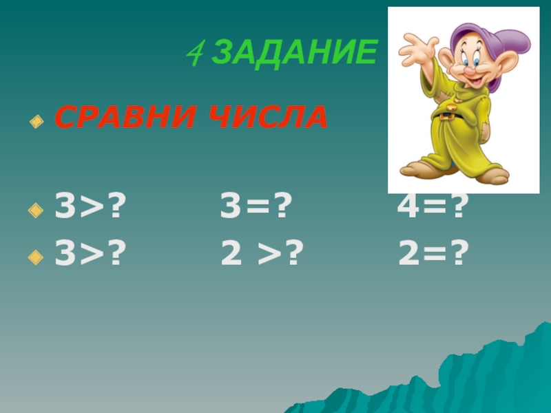 4 ЗАДАНИЕСРАВНИ ЧИСЛА3>?    3=?     4=?3>?    2 >?