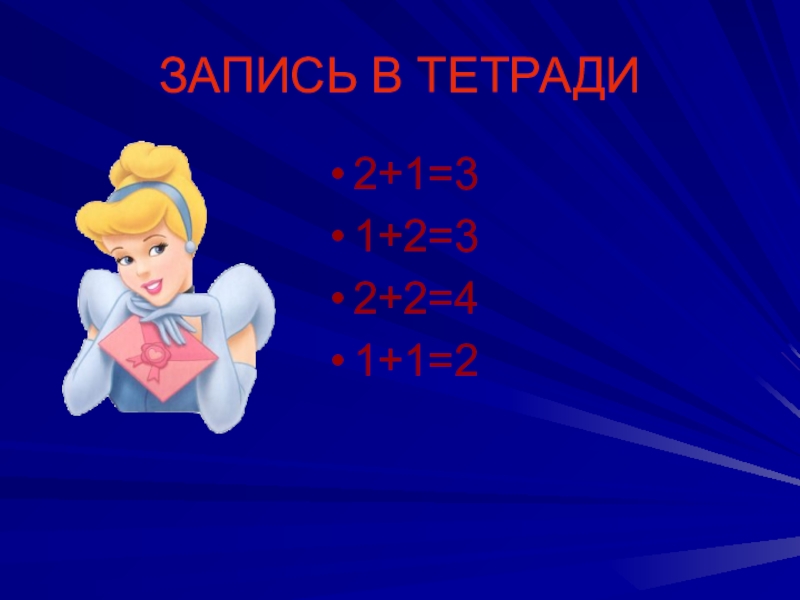 ЗАПИСЬ В ТЕТРАДИ2+1=31+2=32+2=41+1=2