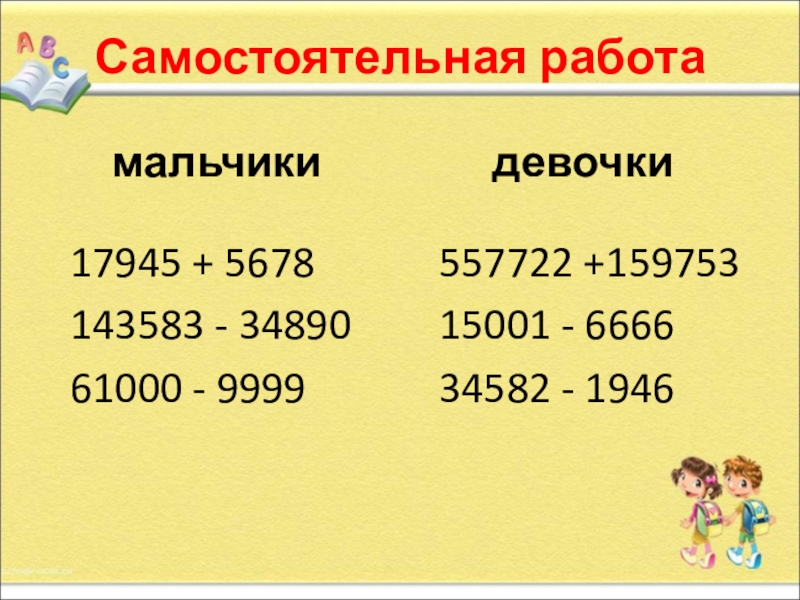 Самостоятельная работамальчики17945 + 5678 143583 - 3489061000 - 9999 девочки557722 +15975315001 - 666634582 - 1946