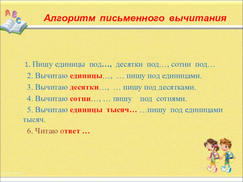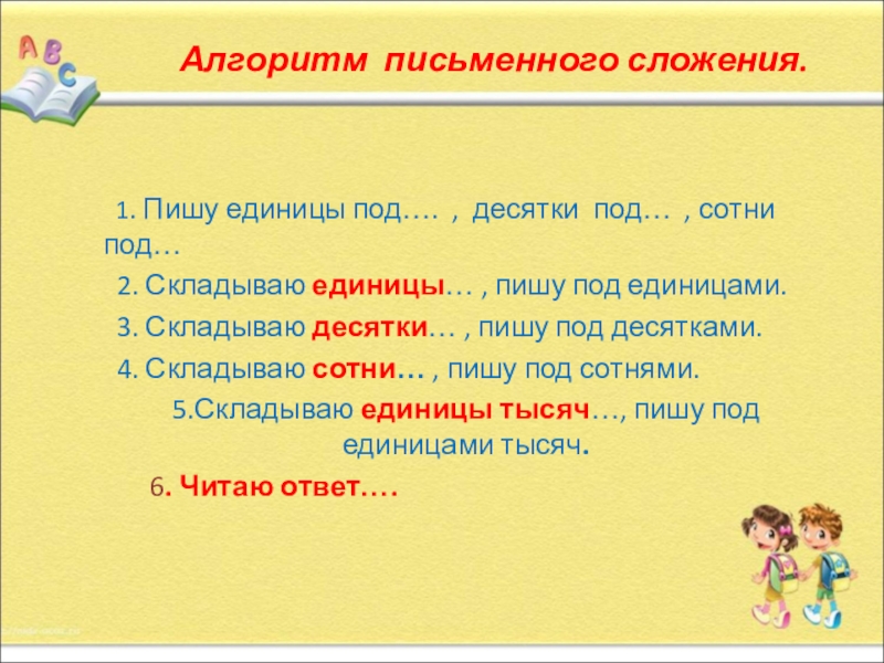 1. Пишу единицы под…. , десятки под… , сотни под…