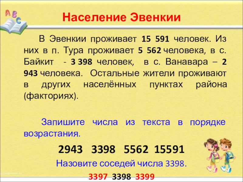Население Эвенкии		В Эвенкии проживает 15 591 человек. Из них в п. Тура проживает 5 562 человека, в с.