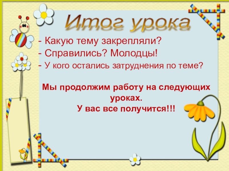 Итог урока - Какую тему закрепляли? - Справились? Молодцы! - У кого остались затруднения по теме? Мы