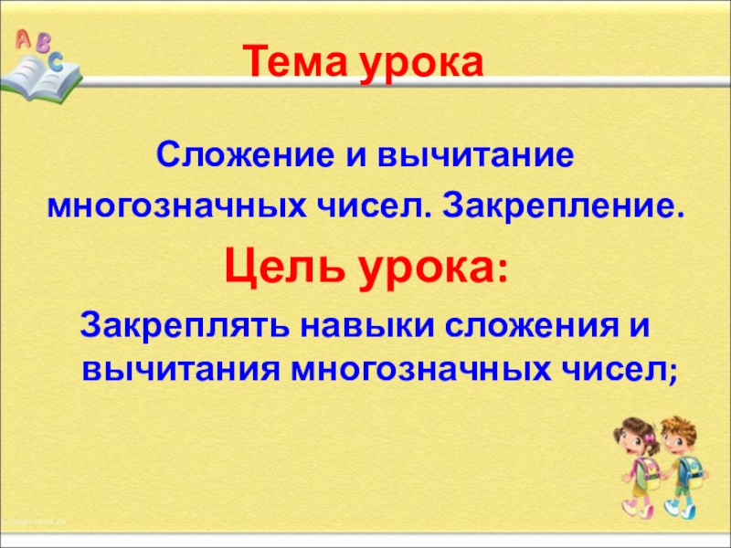 Тема урока Сложение и вычитание многозначных чисел. Закрепление.Цель урока:Закреплять навыки сложения и вычитания многозначных чисел;