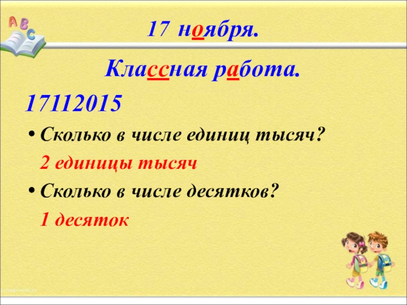 17 ноября. Классная работа.17112015Сколько в числе единиц тысяч?  2 единицы тысячСколько в числе десятков?