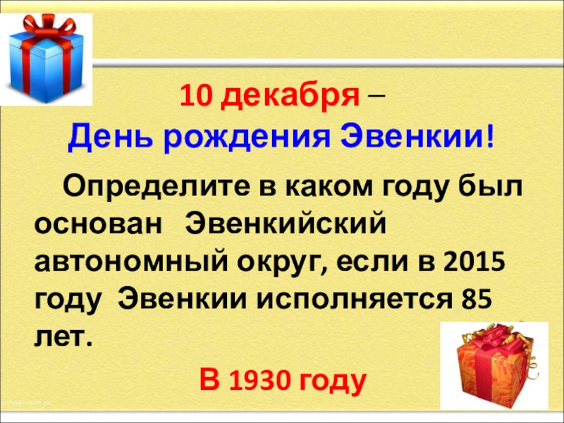 10 декабря –  День рождения Эвенкии!	Определите в каком году был основан  Эвенкийский