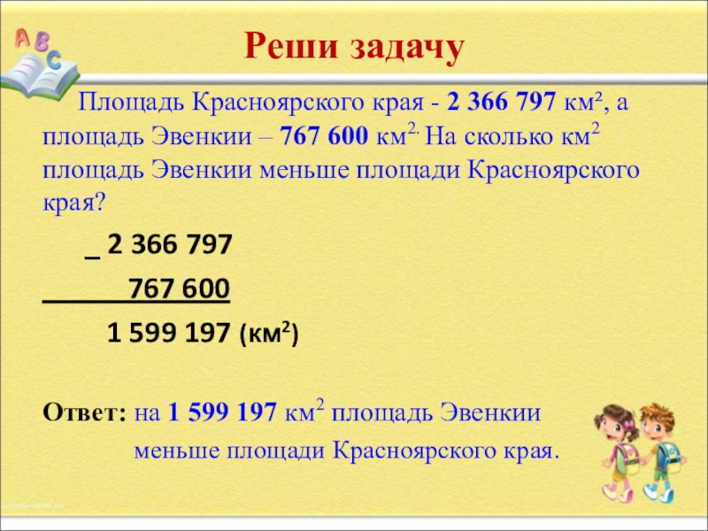 Реши задачу 	Площадь Красноярского края - 2 366 797 км², а площадь Эвенкии – 767 600 км2.