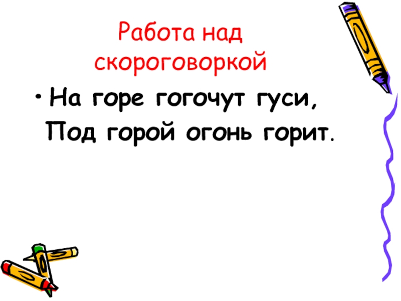 Работа над скороговоркойНа горе гогочут гуси, Под горой огонь горит.