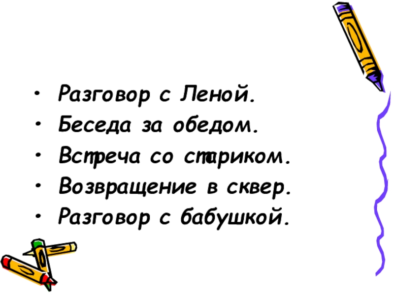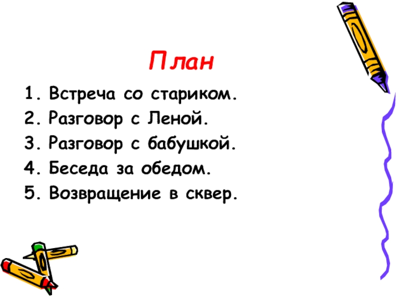 ПланВстреча со стариком.Разговор с Леной.Разговор с бабушкой.Беседа за обедом.Возвращение в сквер.