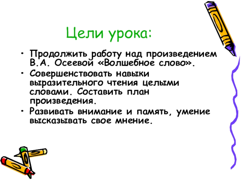 Цели урока:Продолжить работу над произведением В.А. Осеевой «Волшебное слово».Совершенствовать навыки выразительного чтения целыми словами. Составить план произведения.Развивать
