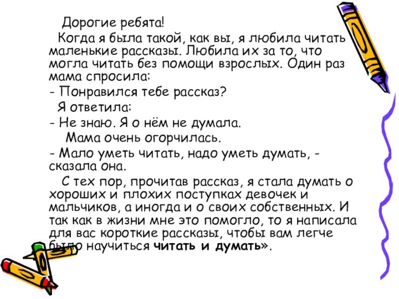 Дорогие ребята!   Когда я была такой, как вы, я любила читать