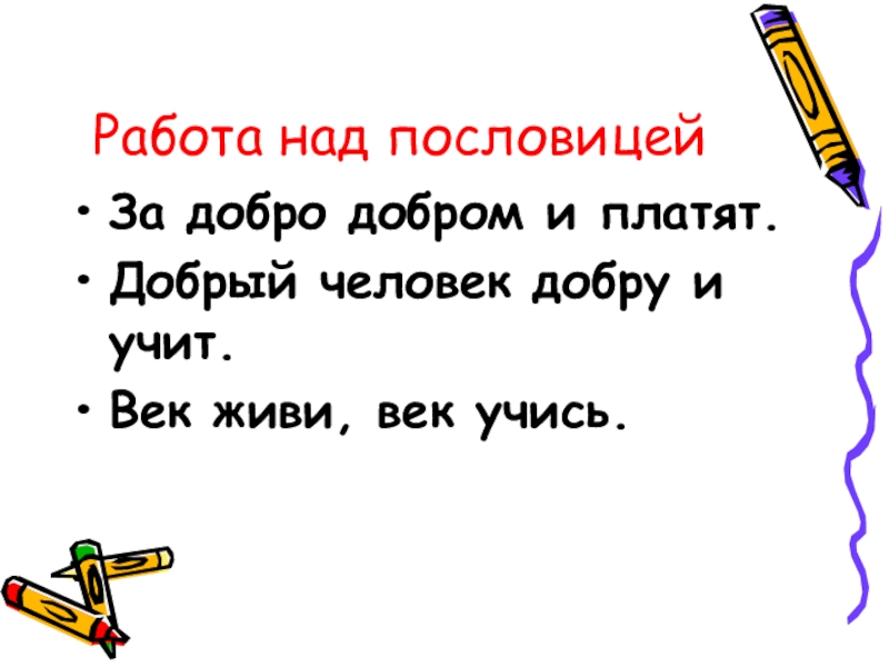 Работа над пословицейЗа добро добром и платят.Добрый человек добру и учит.Век живи, век учись.