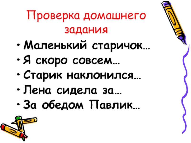 Проверка домашнего заданияМаленький старичок…Я скоро совсем…Старик наклонился…Лена сидела за…За обедом Павлик…