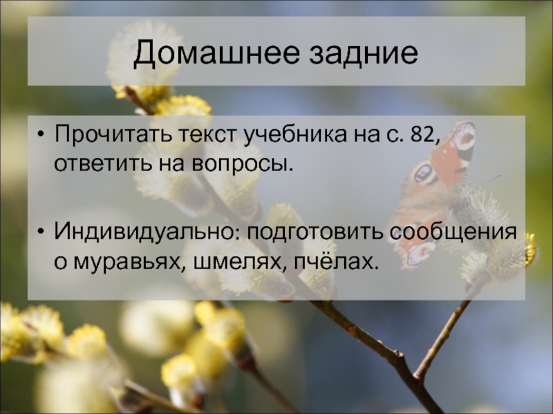 Домашнее задниеПрочитать текст учебника на с. 82, ответить на вопросы.Индивидуально: подготовить сообщения о муравьях, шмелях, пчёлах.