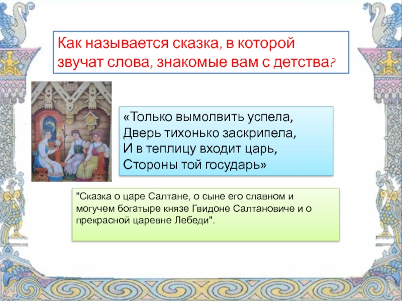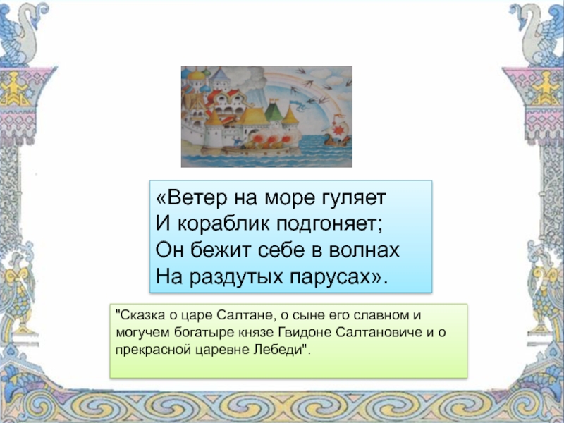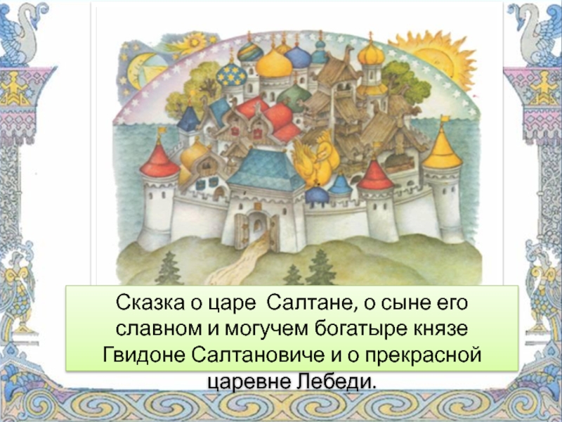 "Сказка о царе Салтане, о сыне его славном и могучем богатыре князе Гвидоне Салтановиче и о прекрасной царевне Лебеди".