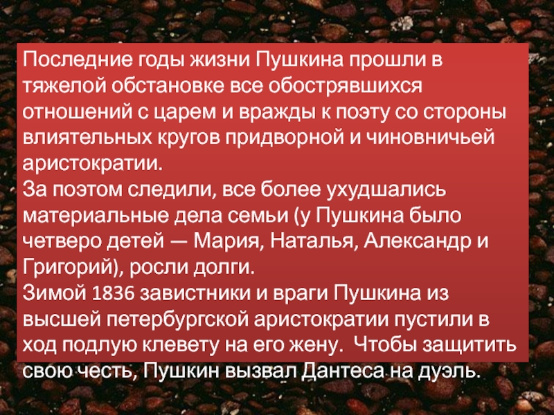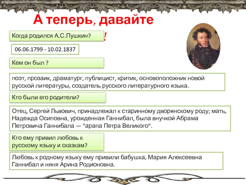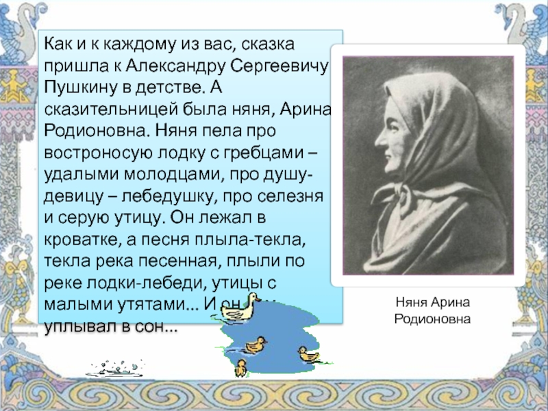 Любовь к родному языку ему привили бабушка, Мария Алексеевна Ганнибал и няня Арина Родионовна.