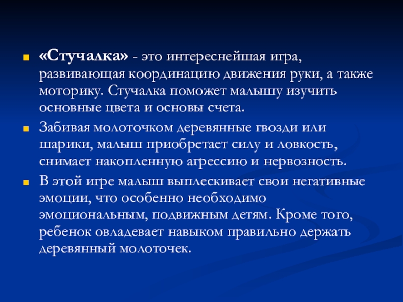 Слайд 71«Стучалка» - это интереснейшая игра, развивающая координацию движения руки, а также