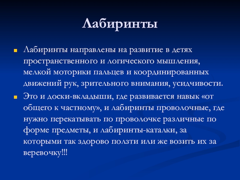 Слайд 60Лабиринты направлены на развитие в детях пространственного и логического мышления, мелкой