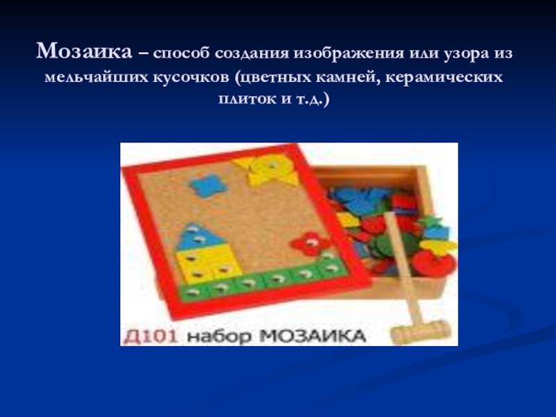 Слайд 67Мозаика – способ создания изображения или узора из мельчайших кусочков (цветных
