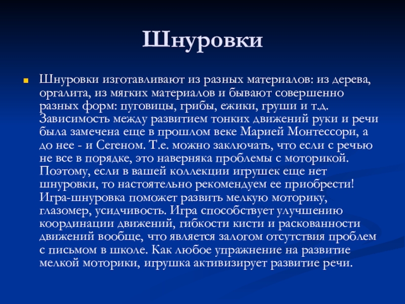 Поэтому, если в вашей коллекции игрушек еще нет шнуровки, то настоятельно рекомендуем ее приобрести! Игра-шнуровка поможет развить мелкую моторику, глазомер, усидчивость. Игра способствует улучшению координации движений, гибкости кисти и раскованности движений вообще, что является залогом отсутствия проблем с письмом в школе. Как любое упражнение на развитие мелкой моторики, игрушка активизирует развитие речи.