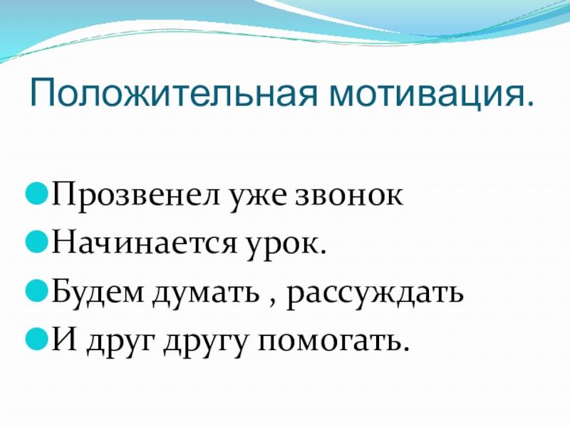 Положительная мотивация.Прозвенел уже звонокНачинается урок.Будем думать , рассуждатьИ друг другу помогать.