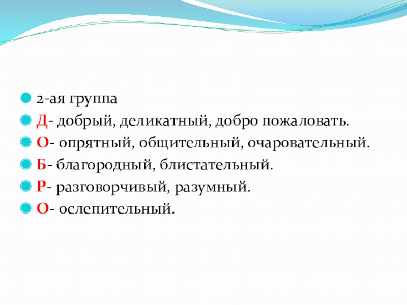 2-ая группаД- добрый, деликатный, добро пожаловать.О- опрятный, общительный, очаровательный.Б- благородный, блистательный.Р- разговорчивый, разумный.О- ослепительный.