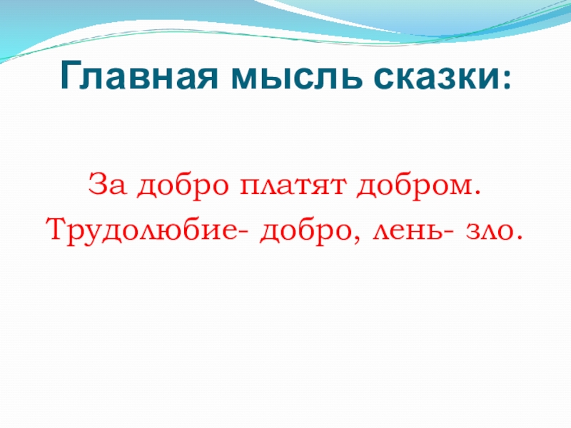 Главная мысль сказки: За добро платят добром.Трудолюбие- добро, лень- зло.