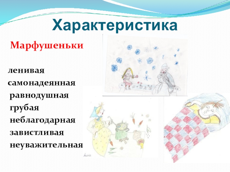 Характеристика Марфушеньки лениваясамонадеянная         равнодушная грубая неблагодарная завистливая неуважительная