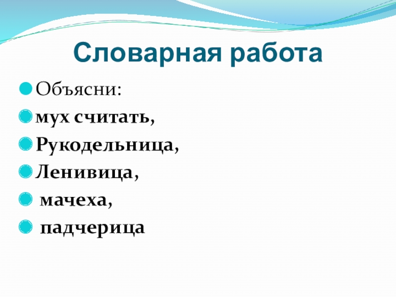 Словарная работаОбъясни: мух считать, Рукодельница, Ленивица, мачеха, падчерица