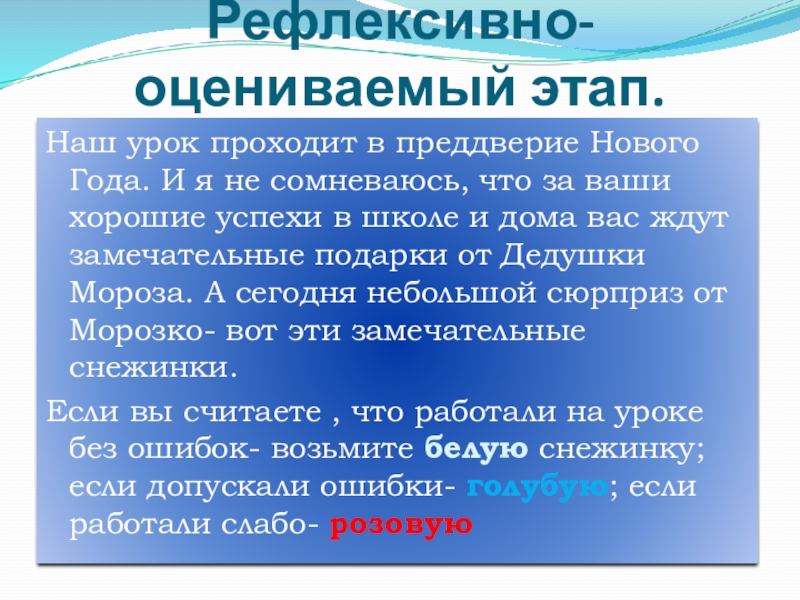 Рефлексивно-оцениваемый этап.Наш урок проходит в преддверие Нового Года. И я не сомневаюсь, что за ваши хорошие успехи