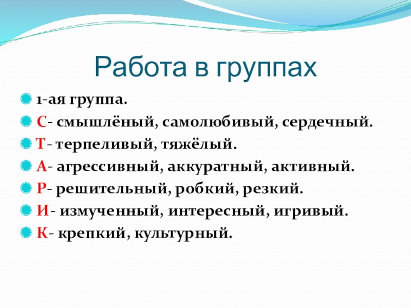 Работа в группах1-ая группа.С- смышлёный, самолюбивый, сердечный.Т- терпеливый, тяжёлый.А- агрессивный, аккуратный, активный.Р- решительный, робкий, резкий.И- измученный, интересный,