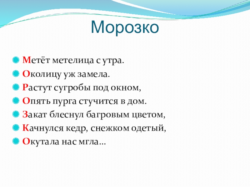МорозкоМетёт метелица с утра.Околицу уж замела.Растут сугробы под окном,Опять пурга стучится в дом.Закат блеснул багровым цветом,Качнулся кедр,