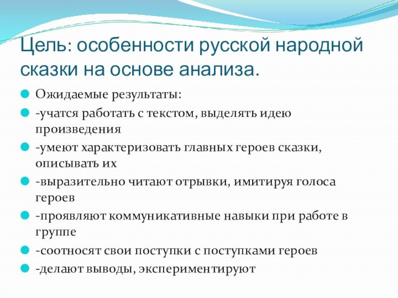 Цель: особенности русской народной сказки на основе анализа.Ожидаемые результаты: -учатся работать с текстом, выделять идею произведения-умеют характеризовать главных героев сказки, описывать их-выразительно читают отрывки, имитируя голоса героев-проявляют коммуникативные навыки при работе в группе-соотносят свои поступки с
