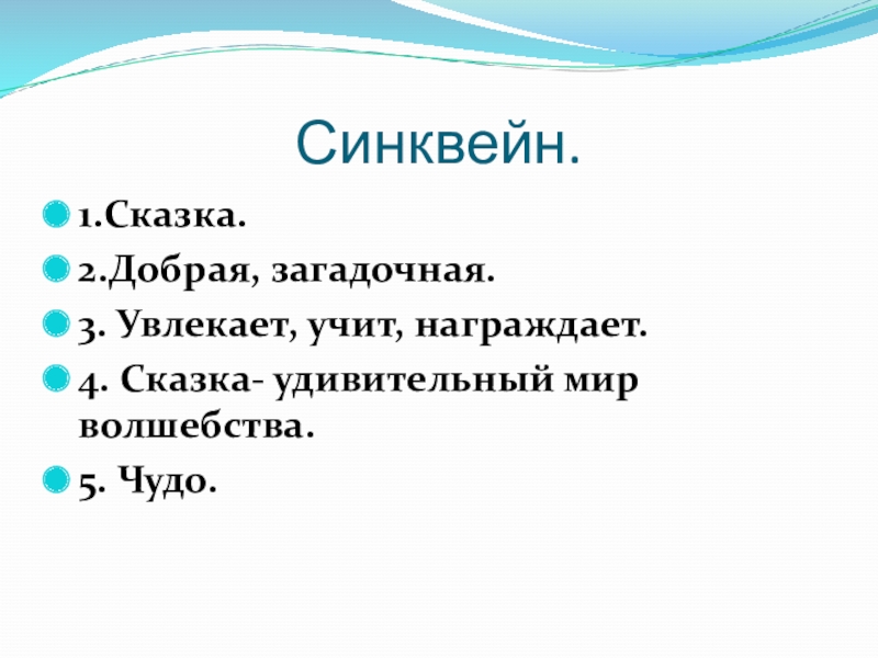Синквейн.1.Сказка.2.Добрая, загадочная.3. Увлекает, учит, награждает.4. Сказка- удивительный мир волшебства.5. Чудо.