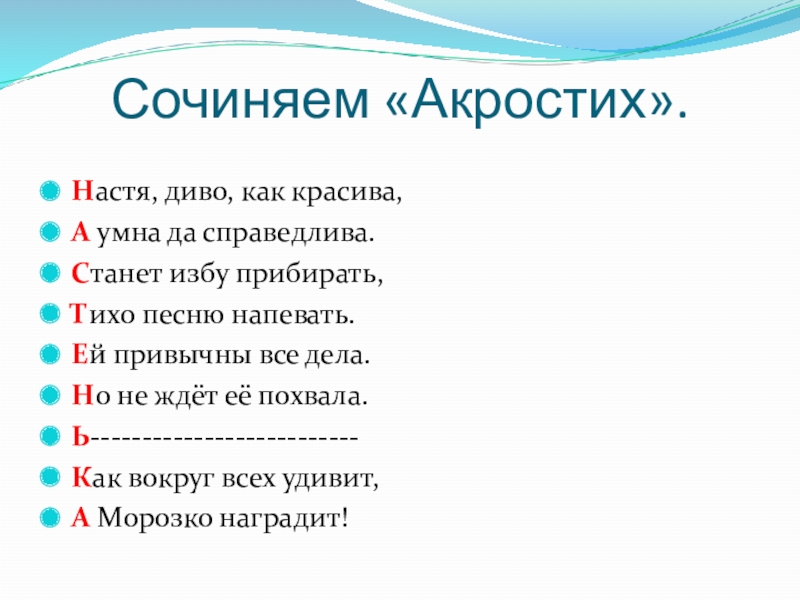 Сочиняем «Акростих».Настя, диво, как красива,А умна да справедлива.Станет избу прибирать,Тихо песню напевать.Ей привычны все дела.Но не ждёт